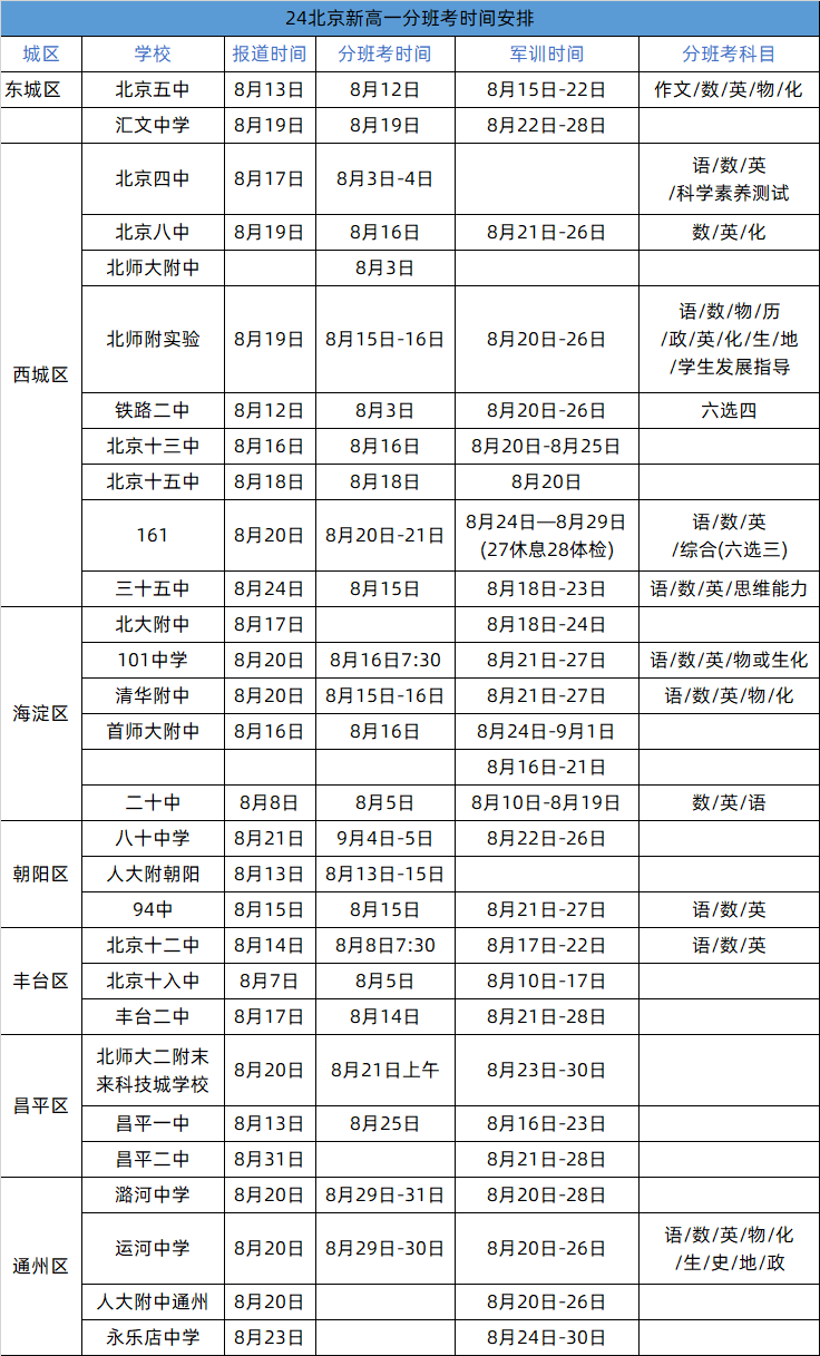 北京二中的新生们需注意,8月16日(周五)将进行分班考试,考试科目包括语文、数学、物理和英语。紧接着的8月17日(周六),学校还将组织航班加试(注:此处“航班加试”可能为特定专业或项目的测试,具体需根据学校通知)。请同学们关注学校后续通知,确保按时参加各项考试和活动。