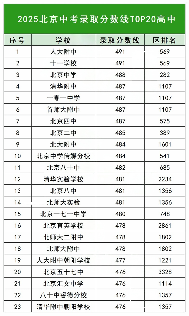 ①以上是根据2025年北京高中录取分数线列举排名前20的学校,数据为热心家长分享,最终录取数据以官方发布为准,且上述同分数段学校排序不分先后。
