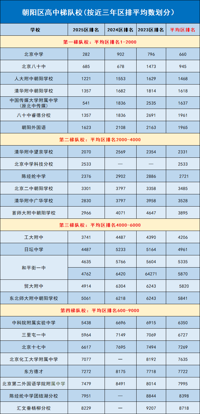 ②朝阳外国语和北京中学科技分校近3年平均区排在3000内,进入第二梯队校的位置;