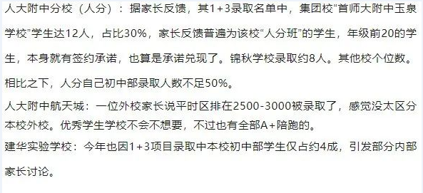 另外,虽然北京中学本都1+3项目在2024年取消了,但2025年分别在北中传媒分校和北中科技分校增加了40和20个名额,据家长分享这些学生都会按照北中实验班来培养,一部分学生会有“小五班”的待遇;2027届及以下中考考生可以重点关注。