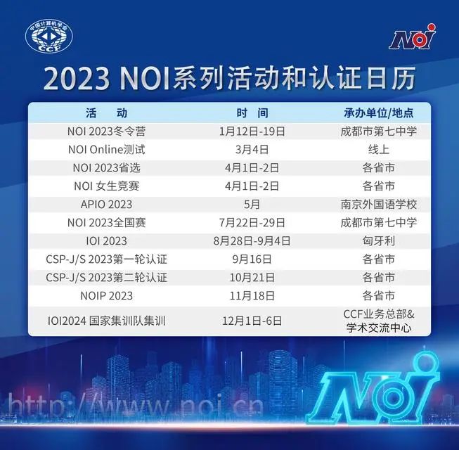 NOI春季测试将于2023年3月4日在各省同步举行。本次春季测试的成绩将会作为NOI 2023北京市省选总成绩的重要依据。NOIP 2022北京赛区已完成报名,但受疫情影响未能如期举办。本次春季测试北京赛区报名原则上以NOIP 2022北京赛区报名结果为准。请各指导教师、选手确认参赛情况。如有变更,请于2023年2月16日12:00前联系noibeijing@126.com。